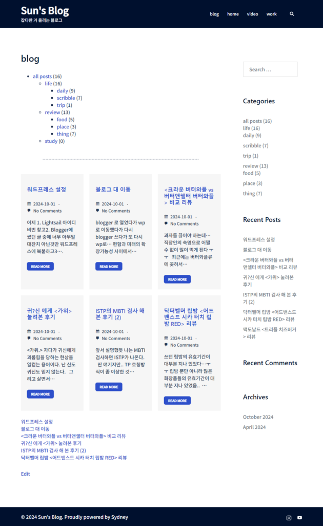오른쪽 Widget의 Categories에 하위 카테고리가 잘 안 보이는거, 상단 메뉴, read more 있는 버튼, 최근 포스팅이 6분할 되어있는거 등등 마음에 안 드는 것 한가득이다.