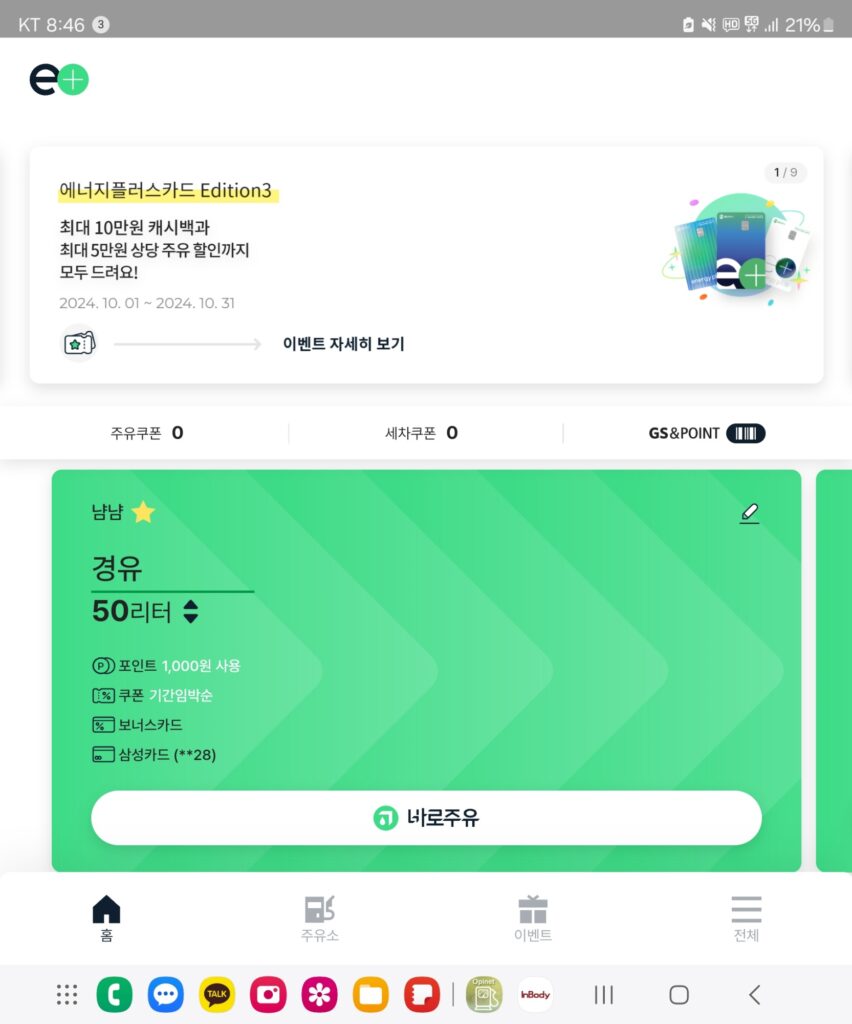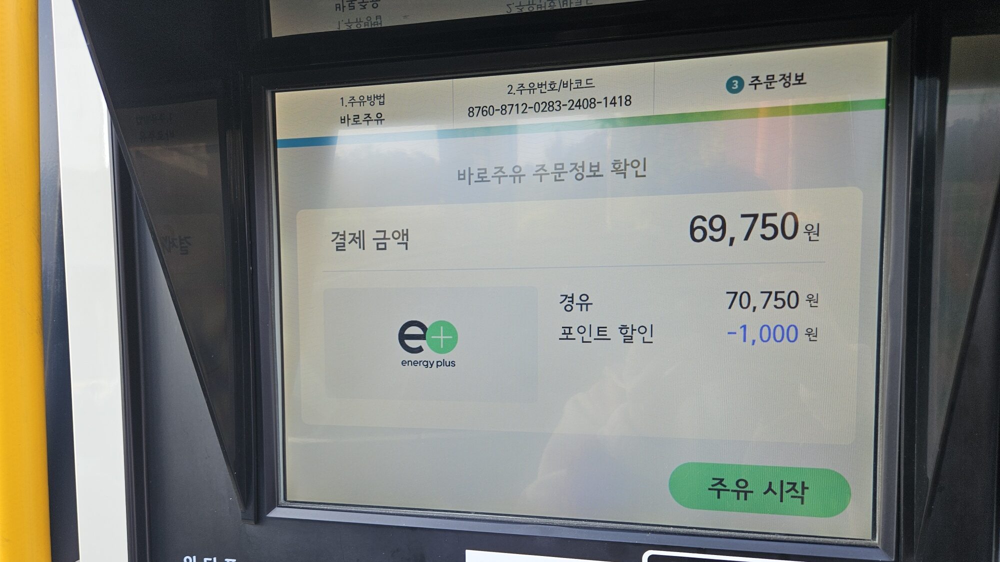 GS에서 주유할 때는 에너지플러스 앱으로 주유하면 엄청 편하다. 나는 50리터 주유를 바로주유로 저장해 두고 50리터씩 충전한다. 어플에서 “바로주유” 클릭해서 바코드만 찍으면 끝.