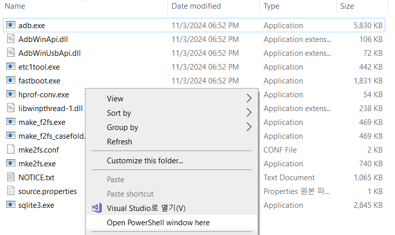 압축을 해제한 Platform-tools 폴더의 빈 공간에서 Shift + 오른쪽 클릭을 통해 “Open PowerShell Window here”를 선택.