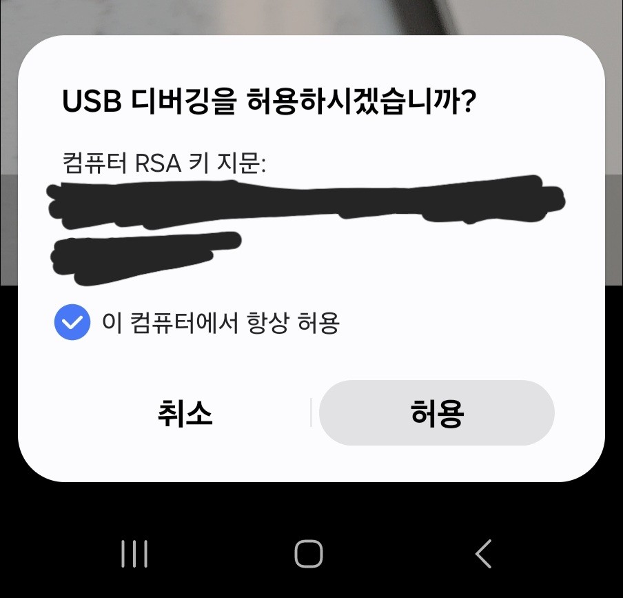 이후 휴대폰 화면에 USB 디버깅 허용할지 묻는 메시지가 나타나면 허용을 선택한다.