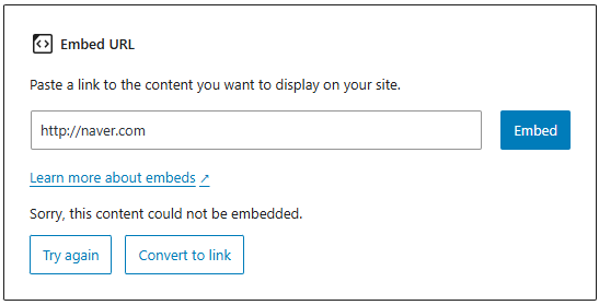 웹사이트 embed 만 하려 하면 <Sorry, this content could not be embedded.> 라고 뜸. 저기에 나온 방법인 Display Conditions를 enable 해서 해결했는데, 원래 embed 지원되지 않는 링크는 소용 없는 듯 하다..
