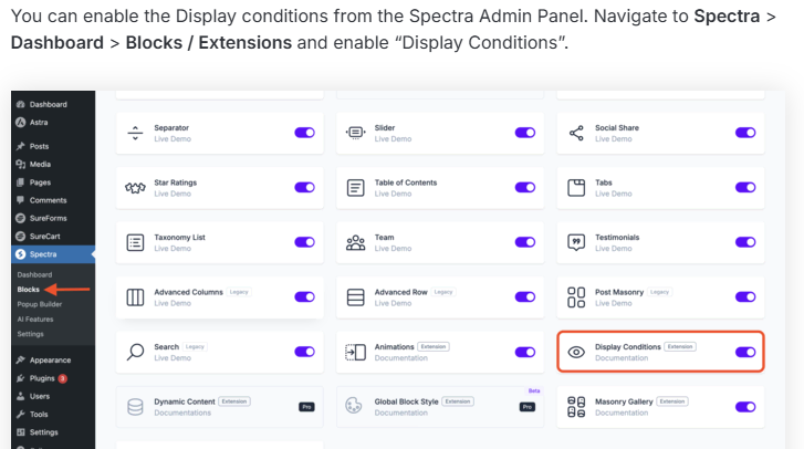 You can enable the Display conditions from the Spectra Admin Panel. Navigate to Spectra > Dashboard > Blocks / Extensions and enable “Display Conditions”.