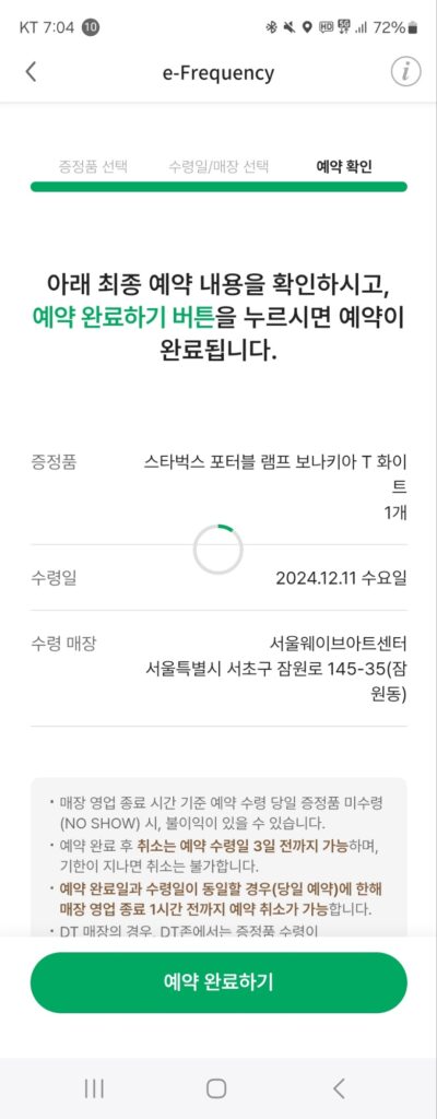 출근하면서 차에서 급하게 클릭해서 예약한 거라 당시에 경유하던 장소에서 가까웠던 <스타벅스 서울웨이브아트센터> 지점에서 수령하는 걸로 예약되었다. 11일에 바빠서 수령도 못 할 뻔 하긴 했는데.. 여튼 결과적으론 성공.