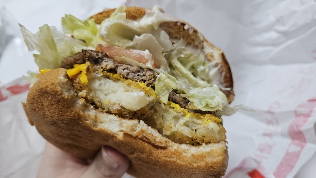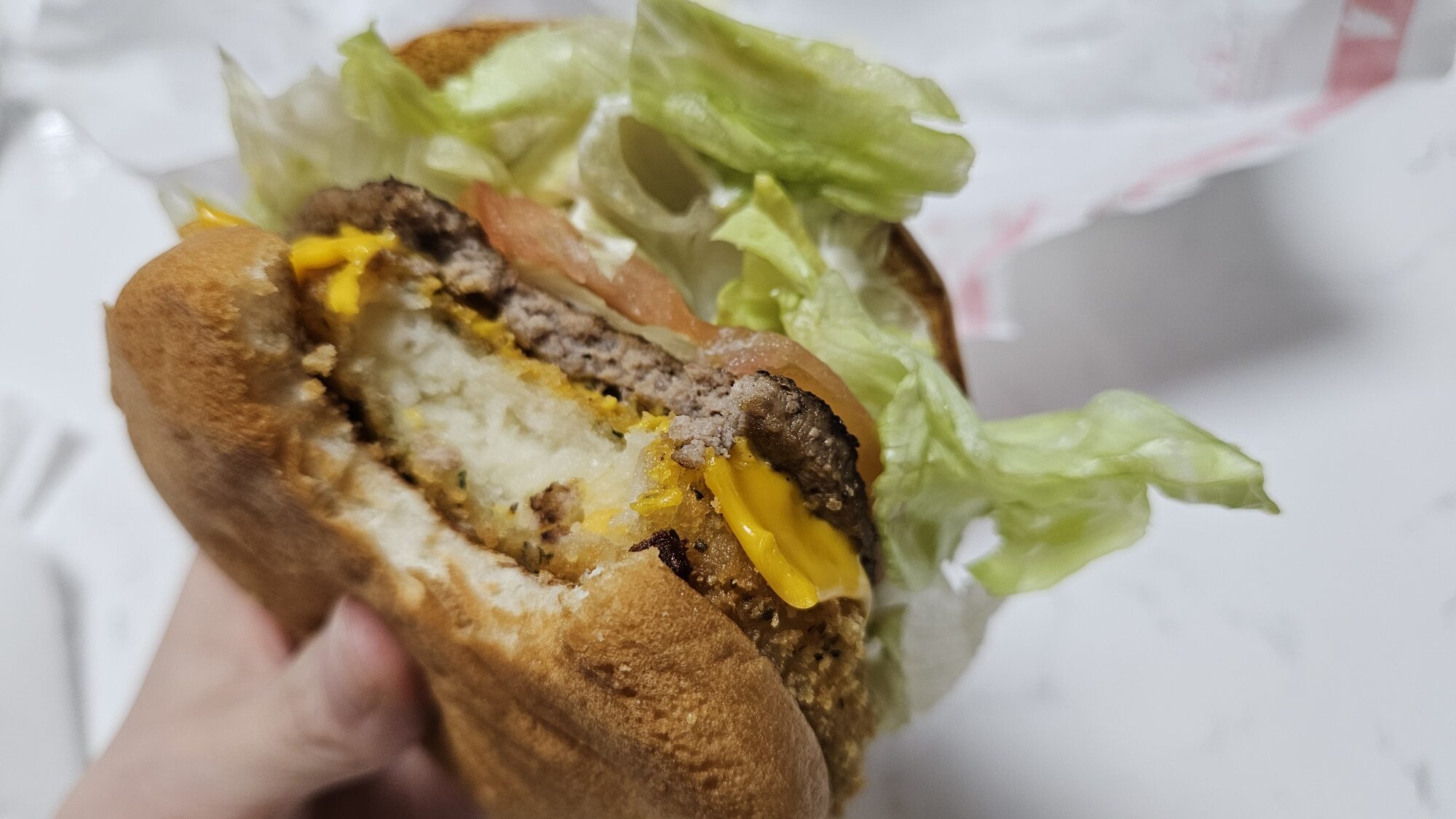 햄버거의 단면. 버거가 생각보다 얇았다. (사진은 내가 뒷부분을 맨손으로 잡는 바람에 내용물이 펼쳐져서 두꺼워 보이는 것임)