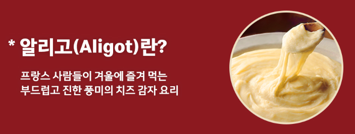 공홈에 알리고가 퐁듀 치즈처럼 부드럽게 묘사되고 있는데(아래 이미지 참조), 기대했던 부드럽고 크리미한 질감은 전혀 아니었다. 실상은 그냥 뻑뻑한 매쉬드 포테이토 튀김일 뿐. 이 공홈의 알리고 이미지가 사기라는걸 널리 <알리고> 싶다.