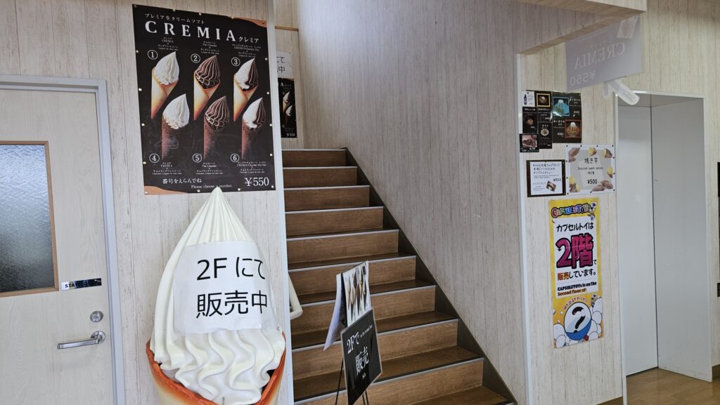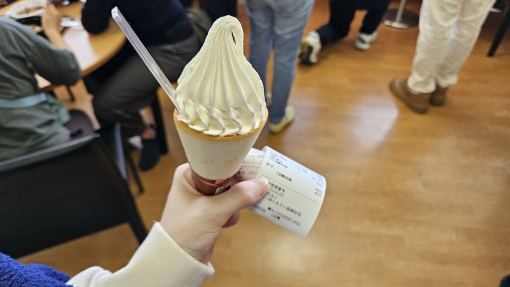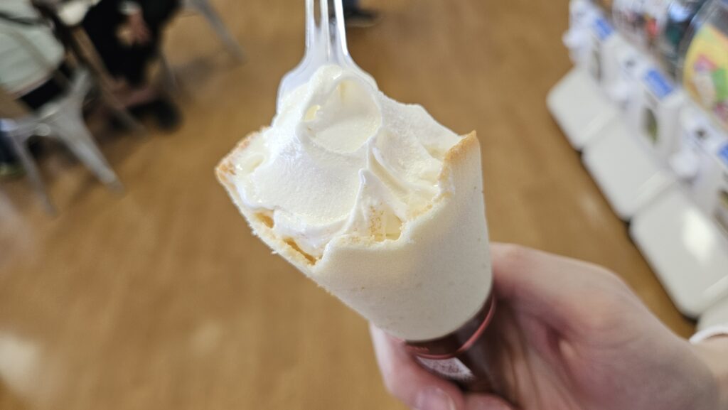 여기 2층 카페테리아 아이스크림의 콘은 쿠크다스(?)같은 것으로 되어 있고, 아이스크림에는 홋카이도산 우유와 유지방이 함유되었다고 한다.