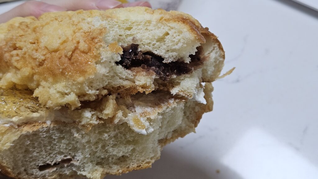빵은 두꺼울 뿐만 아니라 퍽퍽했다. 빵 뿐만 아니라 빵에 들어간 팥앙금도 다른 시중의 단팥소보루 안의 팥앙금에 비해 양도 적고 건조한 편이라 더욱 베어물기 힘들었다. 앞서 언급했듯 빵에 잘 안착되지 못한 크림과 쨈이 건조한 빵 옆으로 마구 흘러내려서 빵의 건조함이 배가되었다.