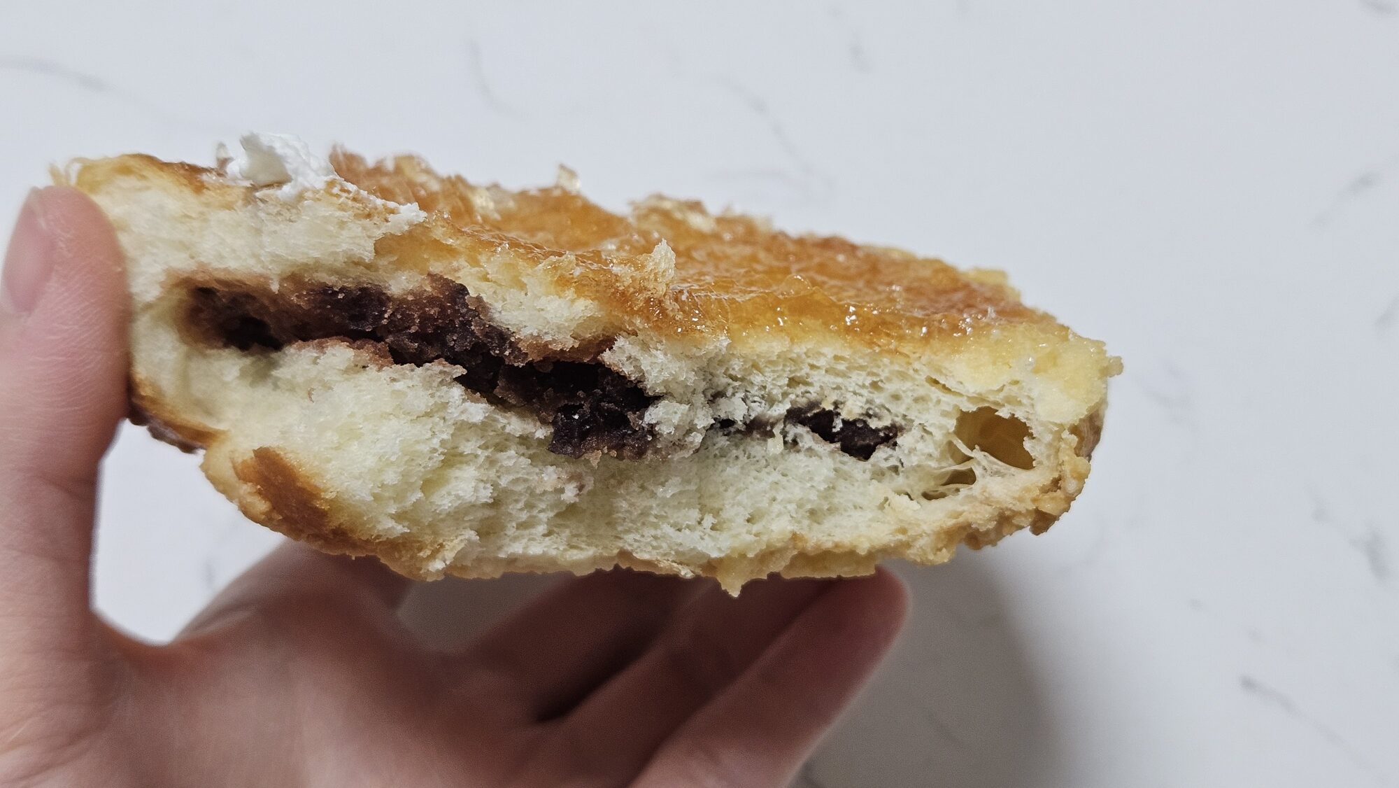 우선 잼. 그냥 일반적인 잼을 빵에 두껍게 발라 놓은 모양새였다. 이 <공장형 맘모스빵>이라는 특성에 맞게 잼 제형을 좀더 고형에 가깝고 덜 흐르게 했어야 했는데, 그러한 최적화가 덜 된, 평범한 사과잼 질감이었다.
