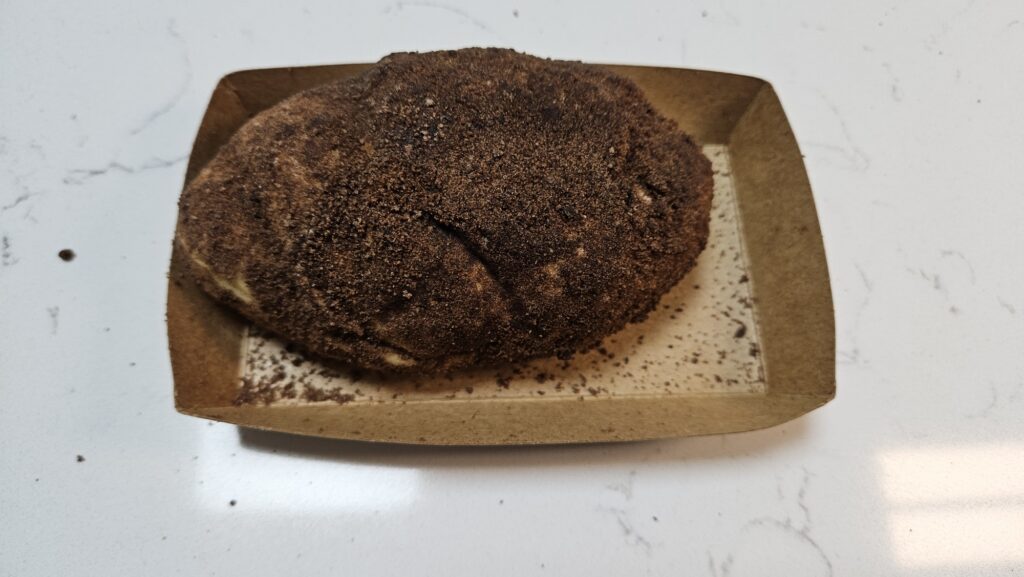 퍽퍽하고 두꺼운 빵의 식감을 보완하기 위해서였다면, 가루보다는 차라리 초코 아이싱 같은 걸 얹는 편이 낫지 않았을까.