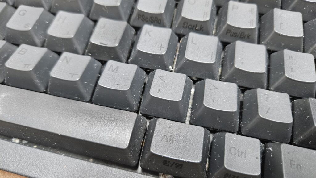 우선 키보드 색상이 어두운 검정색이라 키보드에 앉은 먼지나 이물질이 잘 보여서 더러움이 도드라진다. 미관상 좋지 않음.