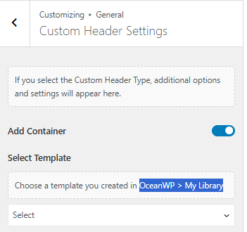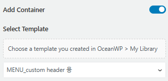 이후 Custom Header Settings 으로 가니 Dashboard > OceanWP > My Library 에서 헤더 템플릿을 직접 만들어서 삽입하란다.