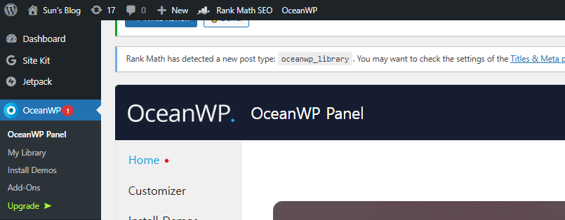 Dashboard 좌측에 OceanWp 메뉴가 생겼다.