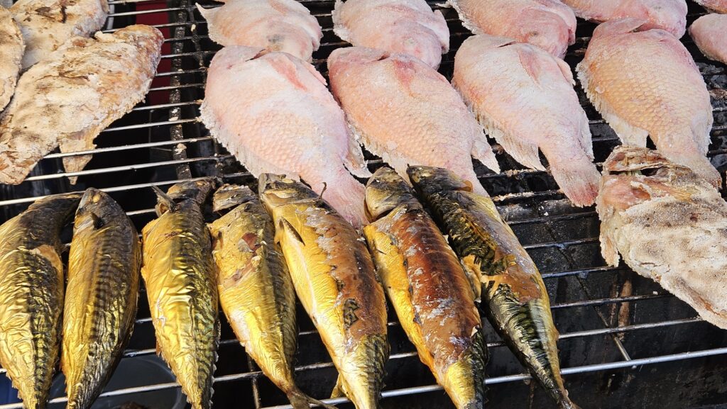 이건 야시장 초입에서 발견한, 굽던 생선. 생선 때깔이 아주 노릇노릇 먹음직스러워서 찍어 봤다.