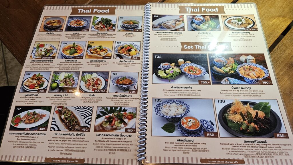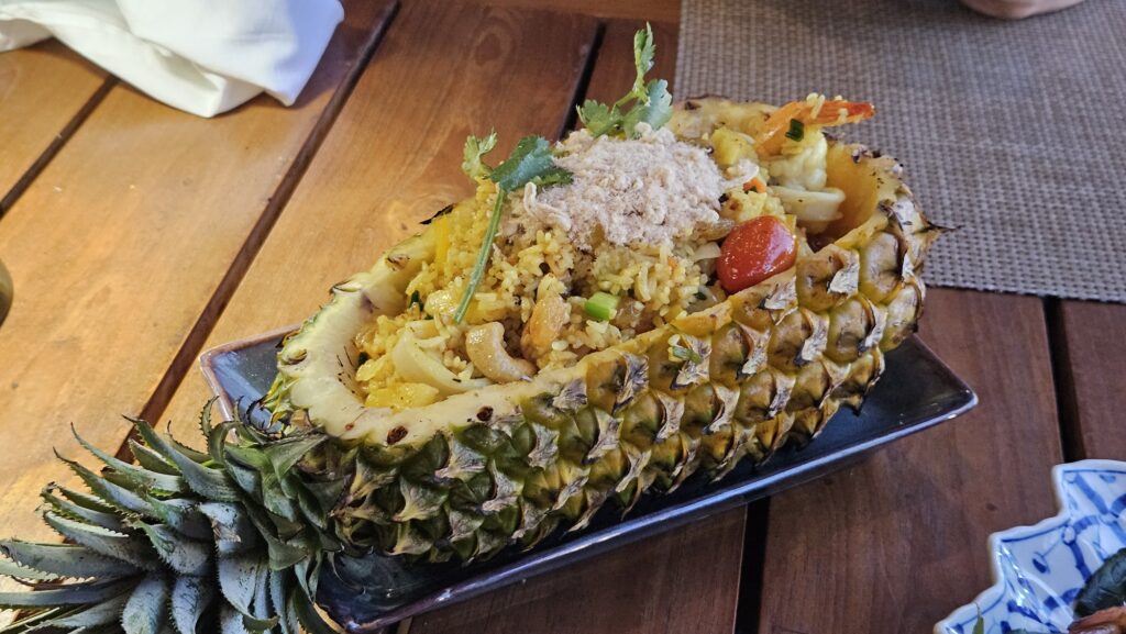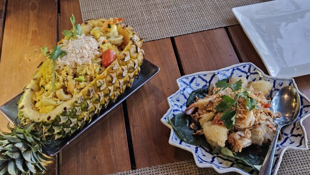 식당의 메뉴 – 야시장에서 더 사 먹을 것을 고려해서 가볍게 파인애플밥이랑 포멜로 샐러드만 시켰다.