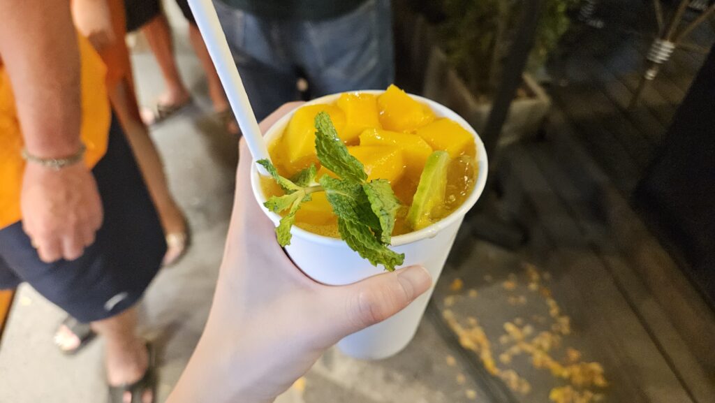 주스 위에 망고조각도 올려 준다! 준비 시간은 오래 걸렸지만 엄청 맛있었다.