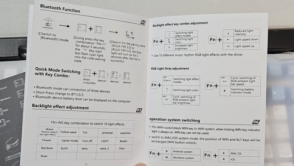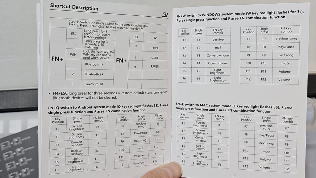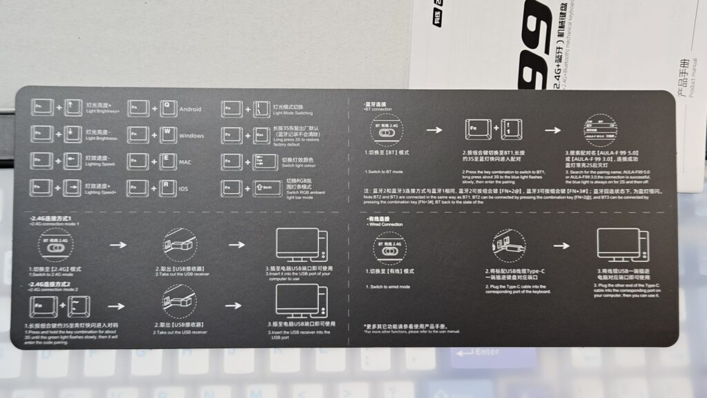흰색 설명서에는 간단한 키보드 단축키나 사용법 등이 기재되어 있다. 앞 부분은 중국어로 쓰여 있다.