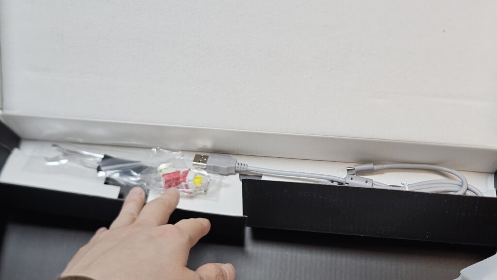 설명서 외에는 키보드와 플라스틱 커버, 여분의 축 2개, 키캡 제거기, USB 연결선이 동봉되어 있다.