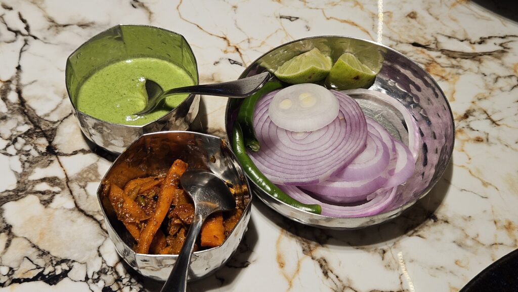 밑반찬으로 정체를 알 수 없는 초록색 소스, 이상한 야채무침, 양파, 길다란 열매(?), 라임이 나왔다.
