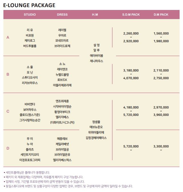 우선, 이게 미리 받아본 이라운지 연계 스드메 가격표다: