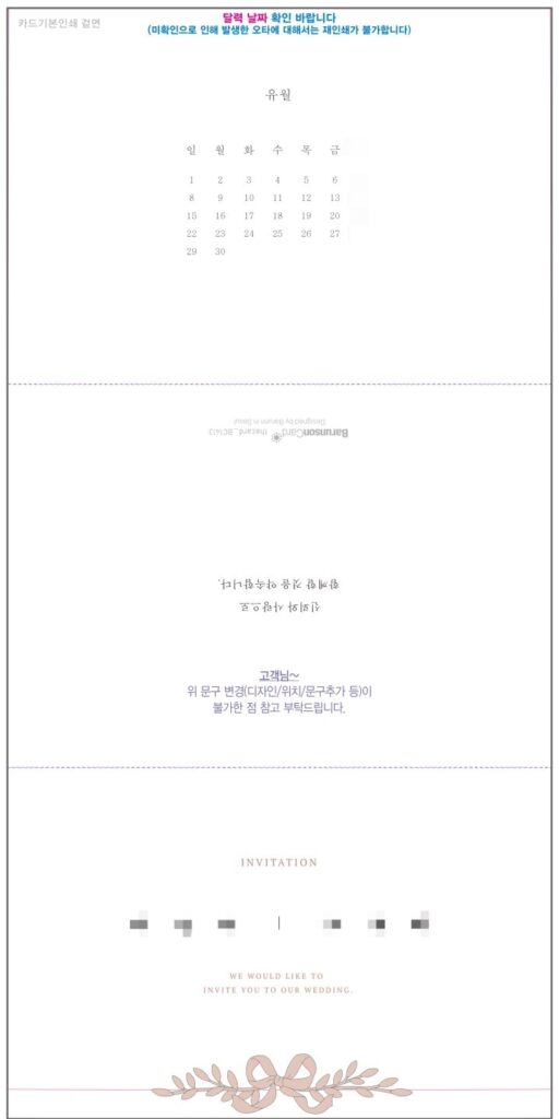 청첩장 결제 후 신랑 신부 혼주 이름 입력하고 문구 고르고 하면 하루 정도 후에 시안을 받을 수 있다. 시안을 보고 이름이랑 날짜가 맞는지 더블체크 하면 된다.