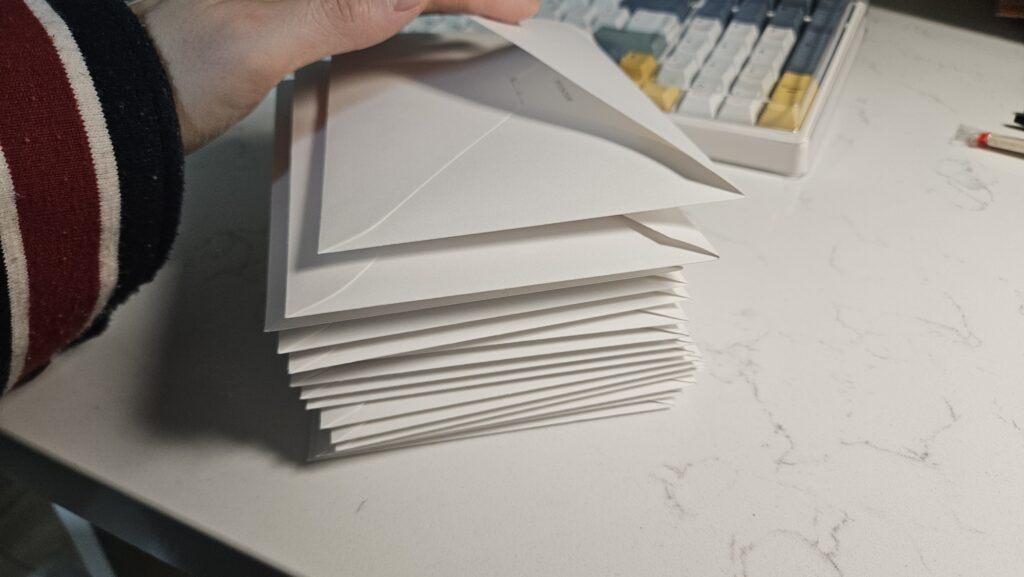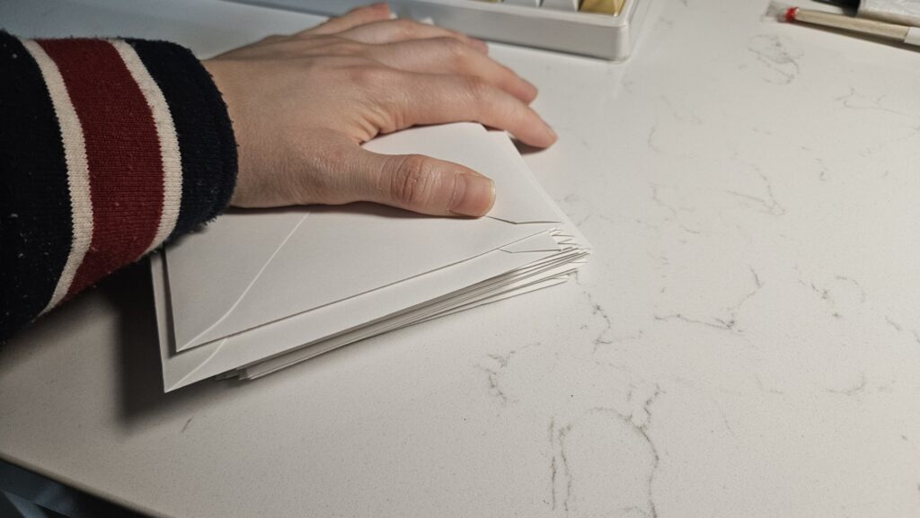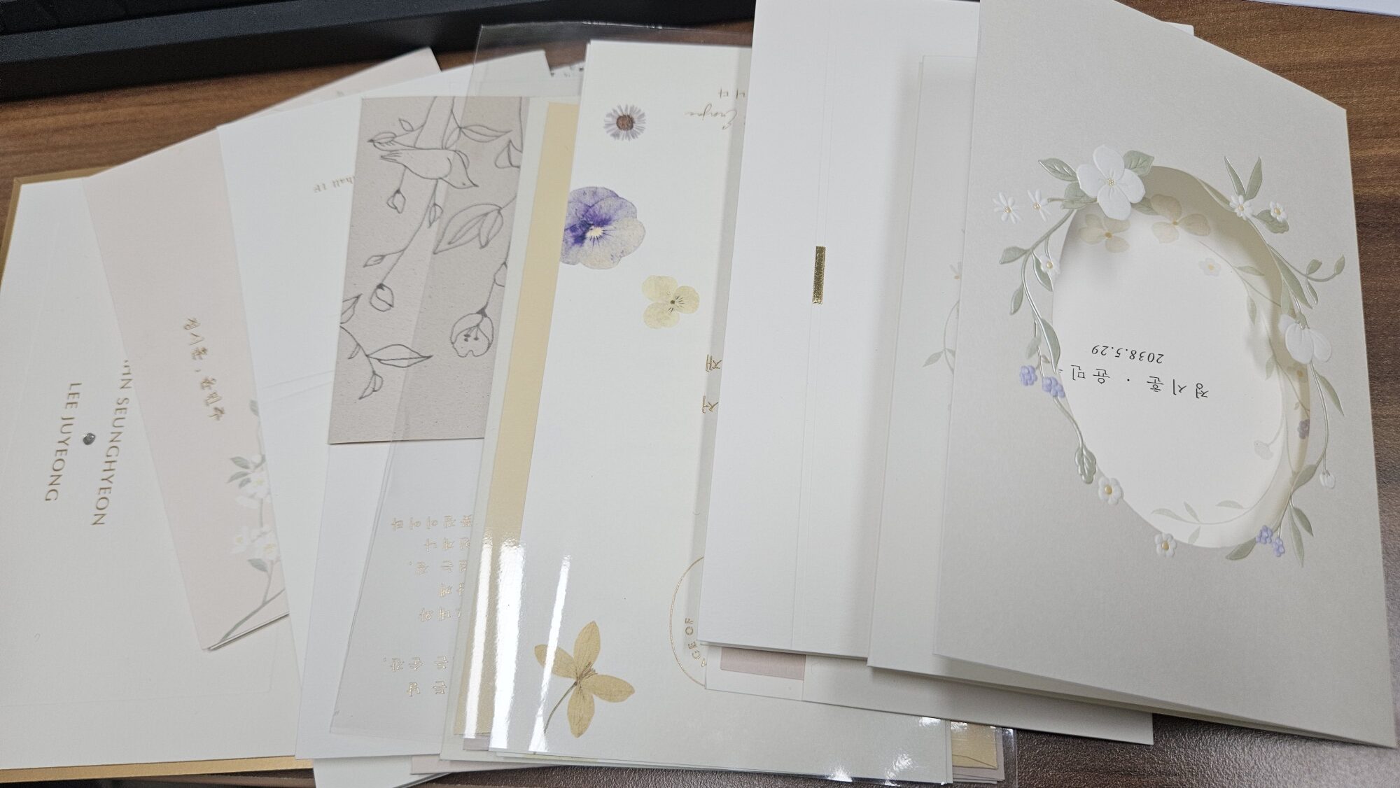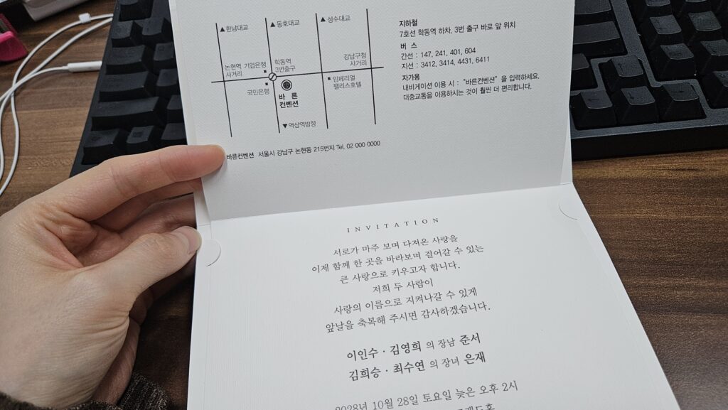 - 접힌 자국이 생긴 청첩장을 대충 봉투에 우겨 넣고