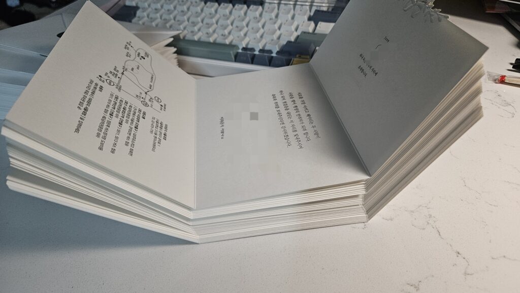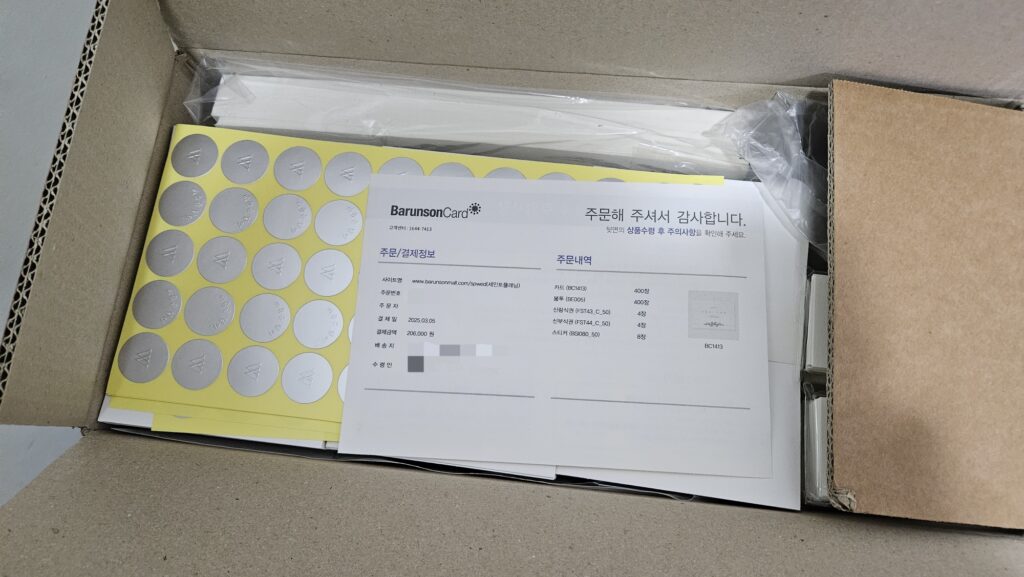 여유롭게 400장 정도 주문했다. 내가 150장, 오빠가 250장 정도 가져감.