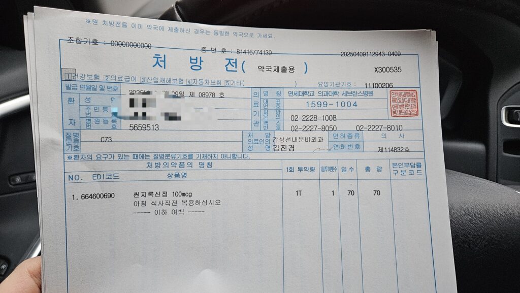 세브란스에 가서 한 번 더 검진을 받았는데, 씬지록신 용량을 75에서 100으로 한 번 더 증량했다.