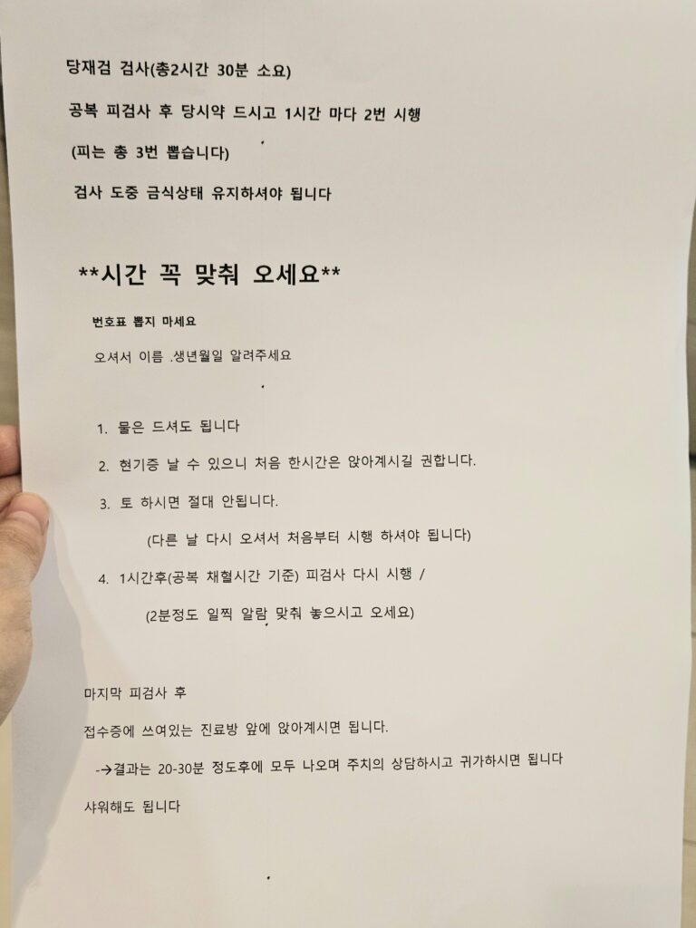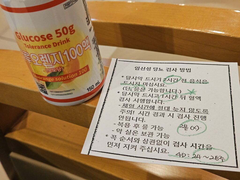 100g 포도당검사용 시약인 글루오렌지 시럽 수급이 불안정하다는 이유로(https://www.dailypharm.com/Users/News/NewsView.html?ID=323807), 정석대로의 투스텝 2차의 100g 가 아닌 원스텝 75g 경구당부하검사를 진행했다.