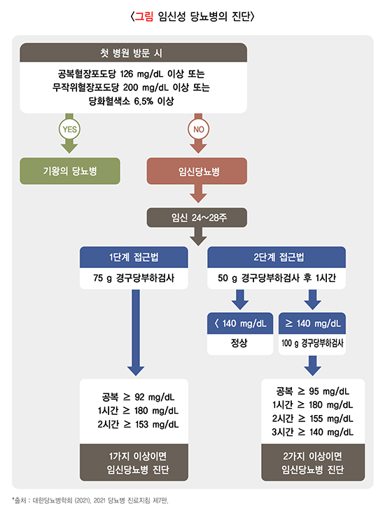 | 1) 원스텝 – 75g 경구당부하검사 – 공복혈당 92mg/dL 이상, 1시간 혈당 180mg/dL 이상, 2시간 혈당 153mg/dL 중 하나 만족하면 진단 2) 투스텝 – 50g 선별검사 후 양성으로 나오면 100g 경구당부하검사 – 50g 포도당 선별검사 – 혈당 140mg/dL 이상 (고위험 산모의 경우, 130mg/dL) 이면 100g 경구포도당검사 시행 – 100g 경구포도당검사 – 공복혈당 95mg/dL 이상, 1시간 혈당 180mg/dL 이상, 2시간 혈당 155mg/dL, 3시간 혈당 140mg/dL 이상 중 두 가지를 만족하면 진단 |