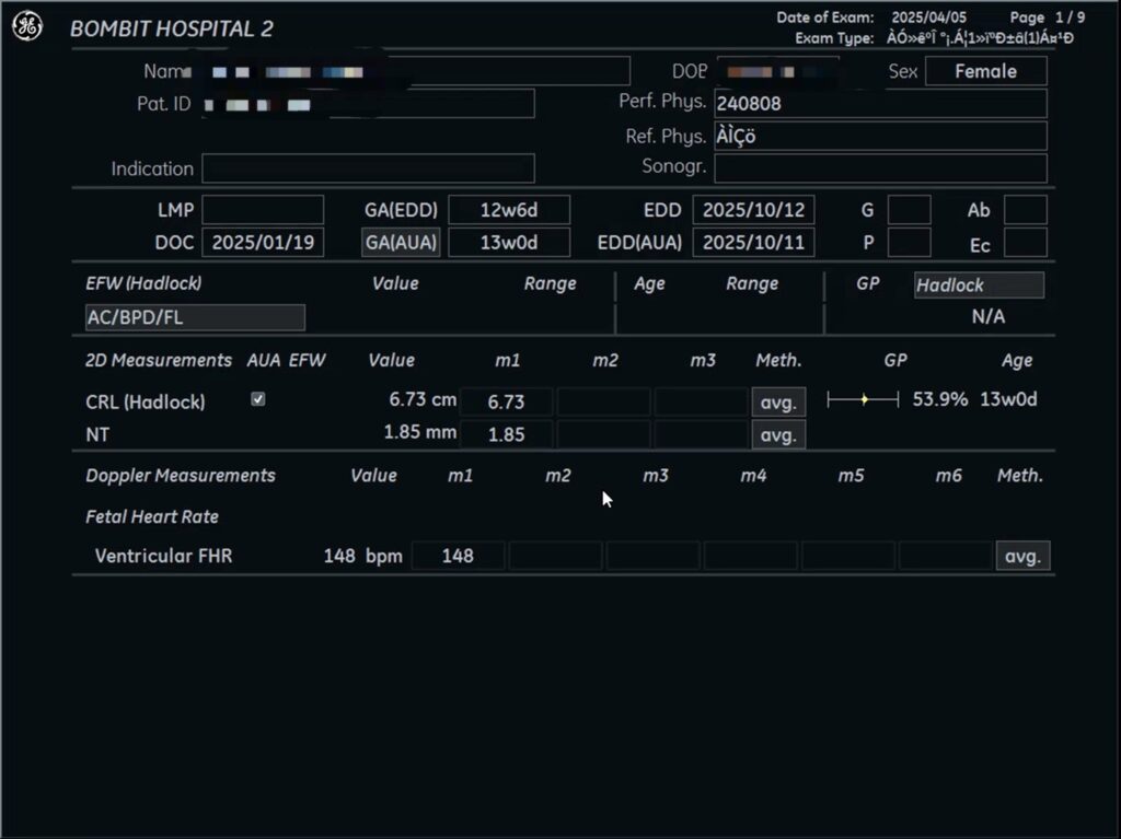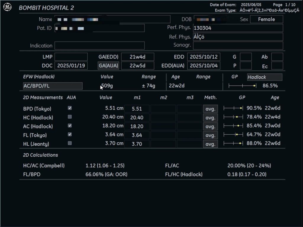 | EFW (Hadlock) | EFW: Estimated Fetal Weight (추정 태아 체중) Hadlock: 가장 일반적으로 사용하는 계산 공식의 이름 (Hadlock formula) → BPD, HC, AC, FL 값을 기반으로 추정한 체중 |