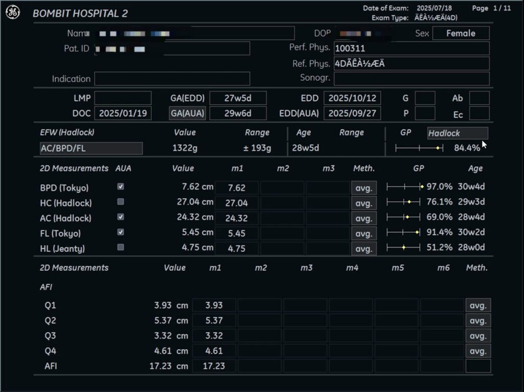| AFI | AFI: Amniotic Fluid Index (양수지수) → 자궁을 4분면으로 나눈 후 각 사분면에서 가장 깊은 양수의 수직 깊이를 합산한 값 → 양수량이 적절한지 확인할 수 있는 지표. Q1, Q2, Q3, Q4 네 값을 더한 총합 |