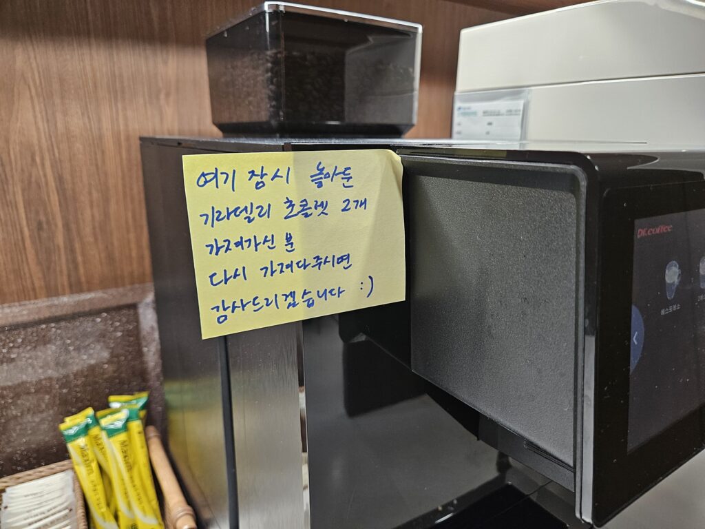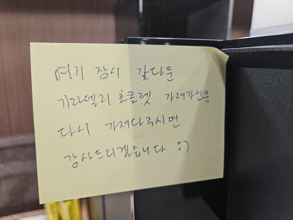 지푸라기라도 잡는 심정으로 초콜렛이 있던 장소에 대문짝만한 포스트잇 현상수배문을 붙여 두었다. 1차로 쓴 현상수배문의 글씨가 너무 얇아 가시성이 떨어지는 것 같아서 한번 교체까지 감행.