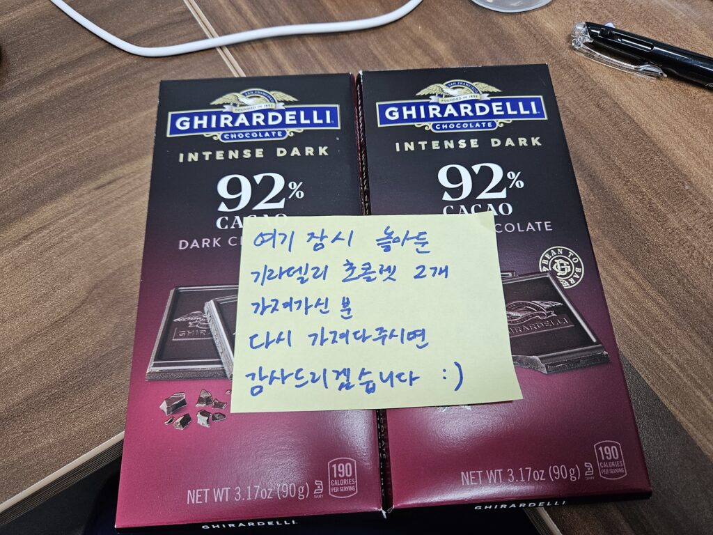 사실 못 찾을 거라고 생각했는데, 점심시간 즈음 보니 초콜릿이 제 자리로 돌아와 있었다. 범인이 어느새 초콜렛을 다시 가져다 놓은 것..!ㅠㅠ