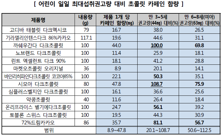 | 제품명 | 내용량(g) | 100g당 카페인 함량(mg) | 제품 1개 당 카페인 함량(mg) |