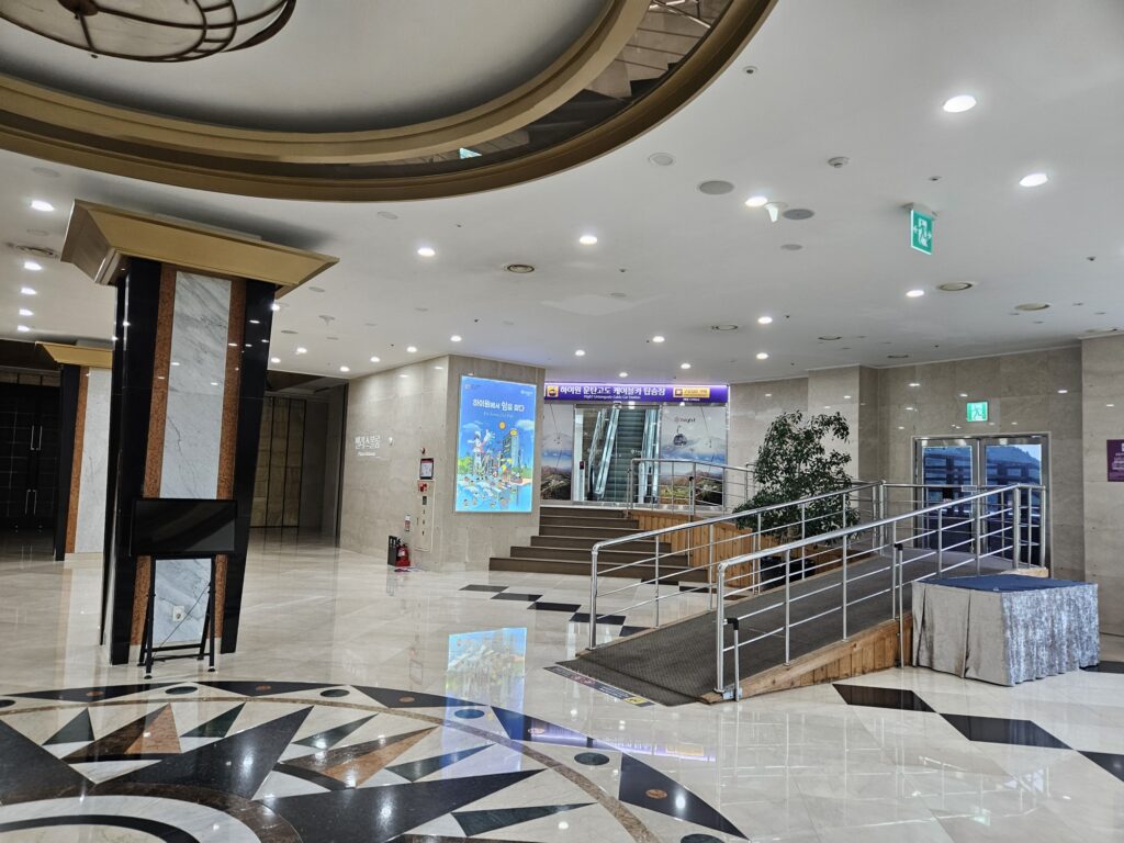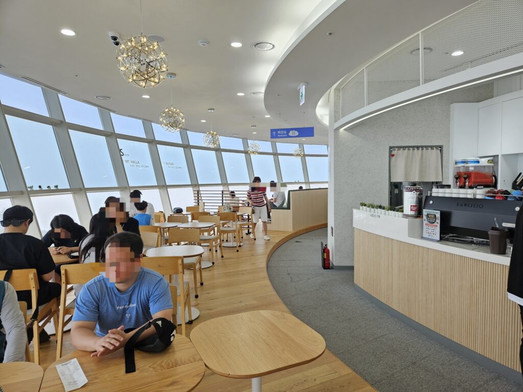 자리 부분의 황토색 나무바닥이 아주 천천히 회전한다. 그래서 오래 앉아있다 보면 외부 광경이 어느새 바뀌어 있다.