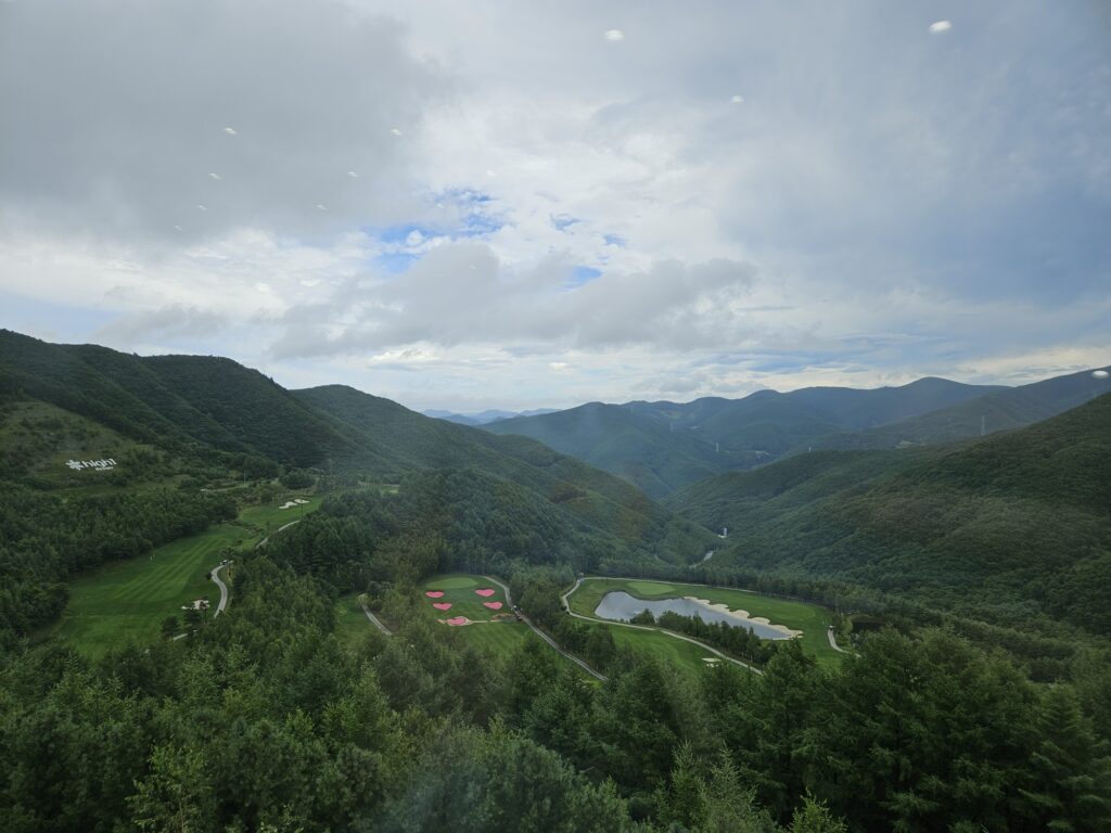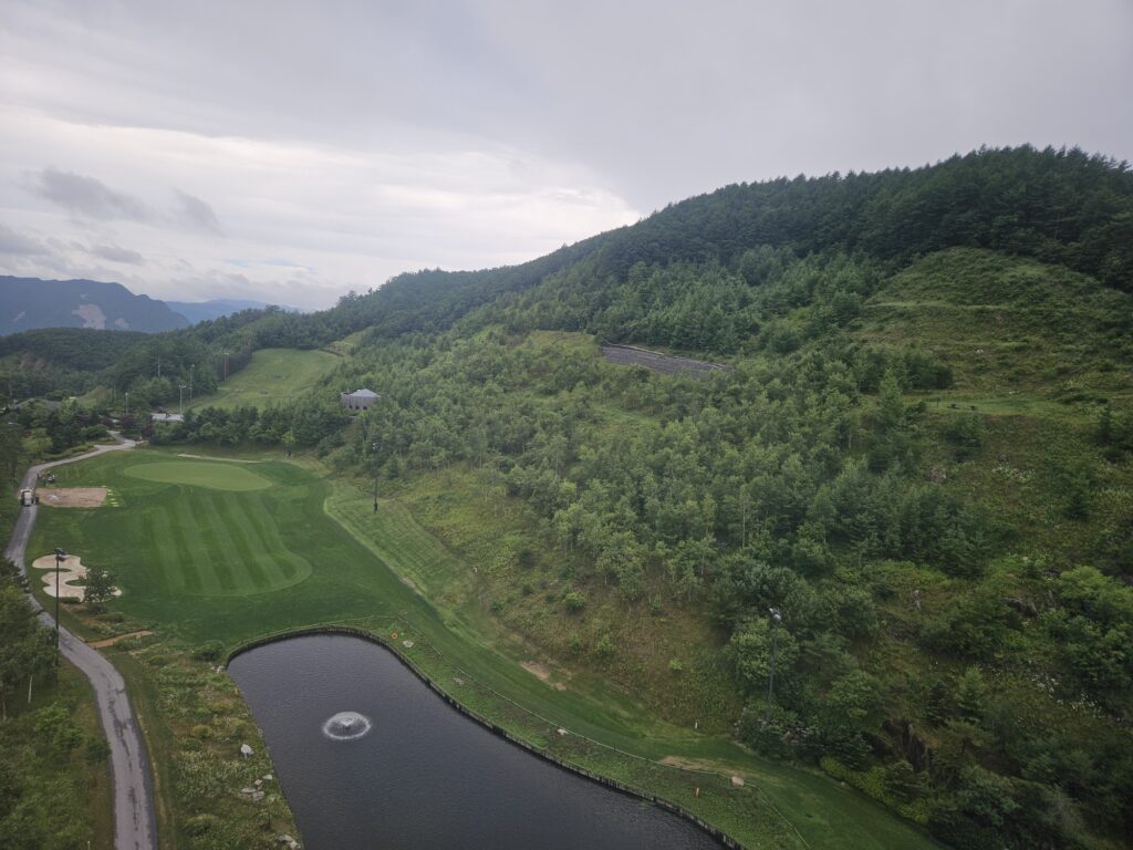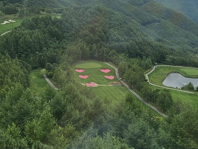 이건 창 밖에 보이는 광경이었는데, 골프 필드 일부분이 핑크색 하트 모양으로 되어 있었다. 핑크색이 엄청 튀었고, 하트 모양이 귀여웠음.