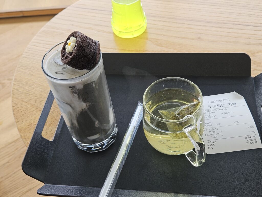 난 왼쪽의 운탄고도 라떼를 마셨는데, 커피가 안 들어가고 달지 않은 흑임자 가루가 들어간 우유였다. 고소하고 맛있었다. 위에 올려져 있던 연탄 모양 브라우니는 오빠가 먹었다 ㅜㅜ