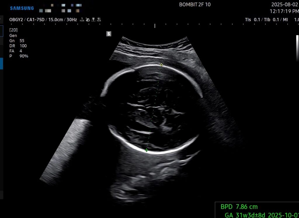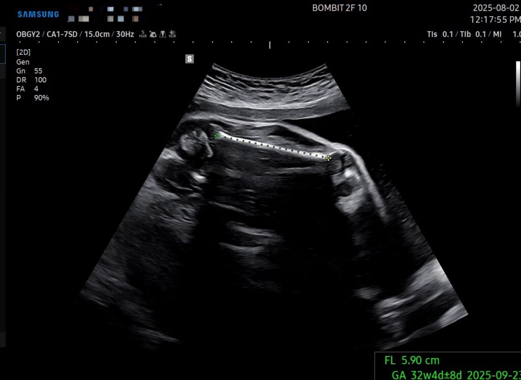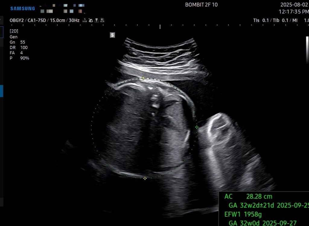29주 6일차의 초음파인데, 몸무게, 배 둘레, 다리 길이 기준으로 주수는 약 32주로 나온다.
