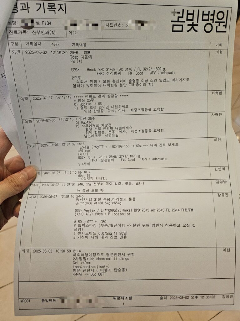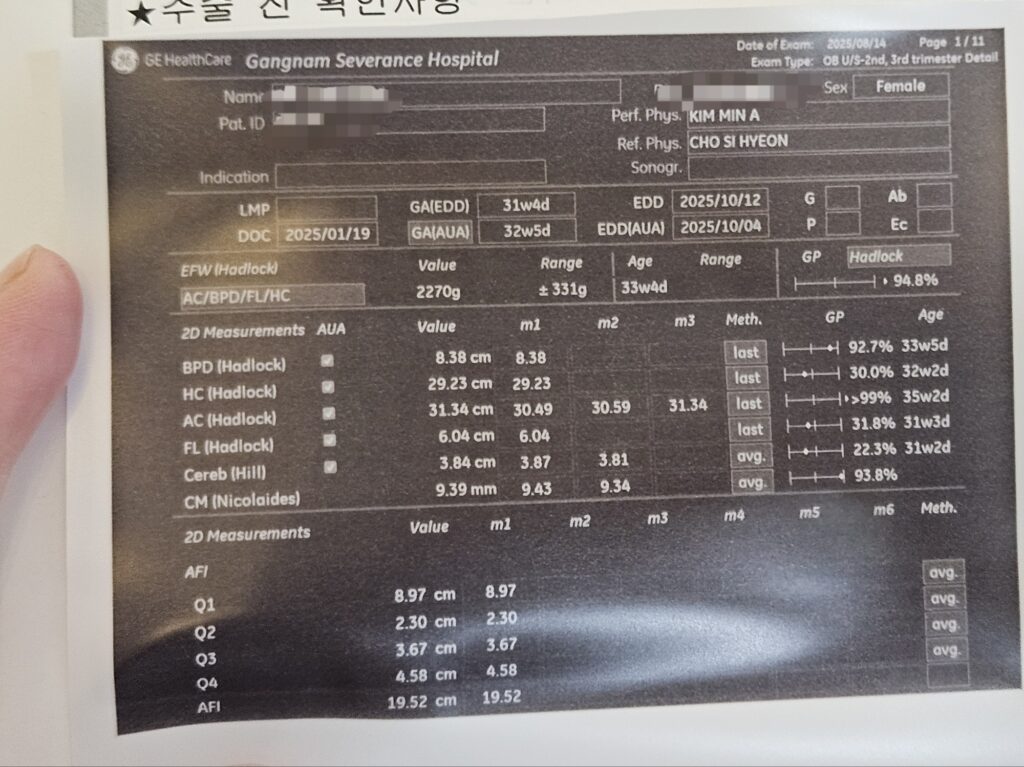진료가 끝나고 아기 측정 수치를 받아보고 싶다고 해서, 아래 사진을 추가로 받았다.