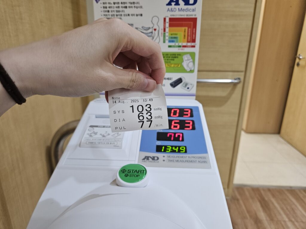 이후 간단히 몸무게랑 혈압을 쟀다. 직원이 따로 재 주지 않아서, 내가 알아서 잰 후 수치를 카운터에 알려줘야 함. 몸무게는 약 8키로 늘었고 혈압은 정상이었다.