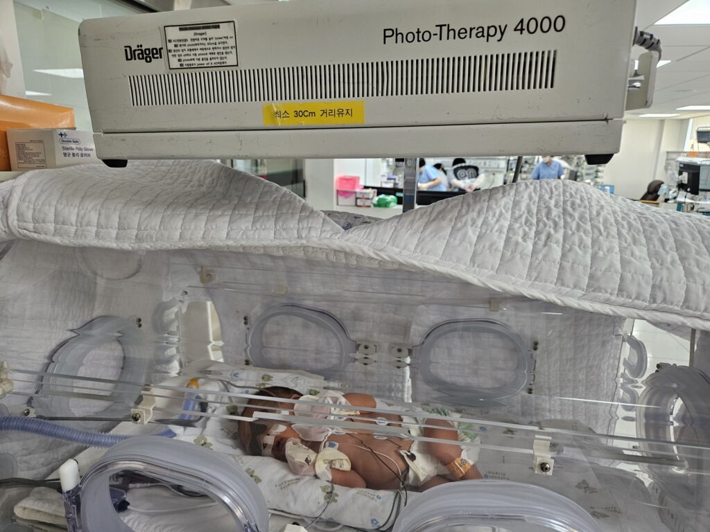 9월 3일(출생 후 3일차)에는 황달이 생겨 광선치료를 했다. 빌리루빈 수치가 10 정도로 다소 높았긴 했지만, 이른둥이는 황달이 더 쉽게 오기 때문에 선제적으로 치료했다고 했다.