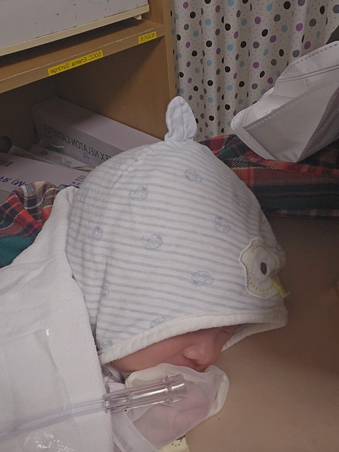 단비는 황달 때문에 광선치료를 다시 하느라 안대를 착용한 채 누워 있었고, 몸 색깔이 노랗고 퍼래 보였다. 그냥 아기 몸 전체 빛깔이 전체적으로 어두웠고, 비전문가인 내가 봐도 명백하게 상태가 좋지 않아 보였다.
